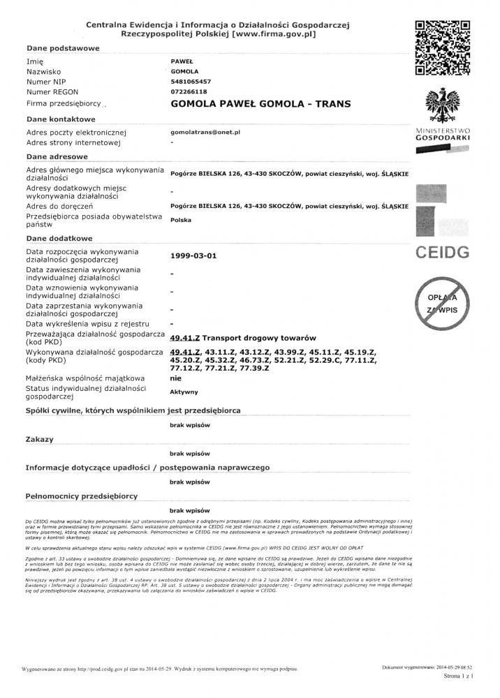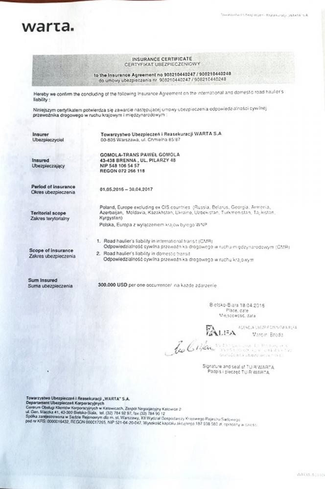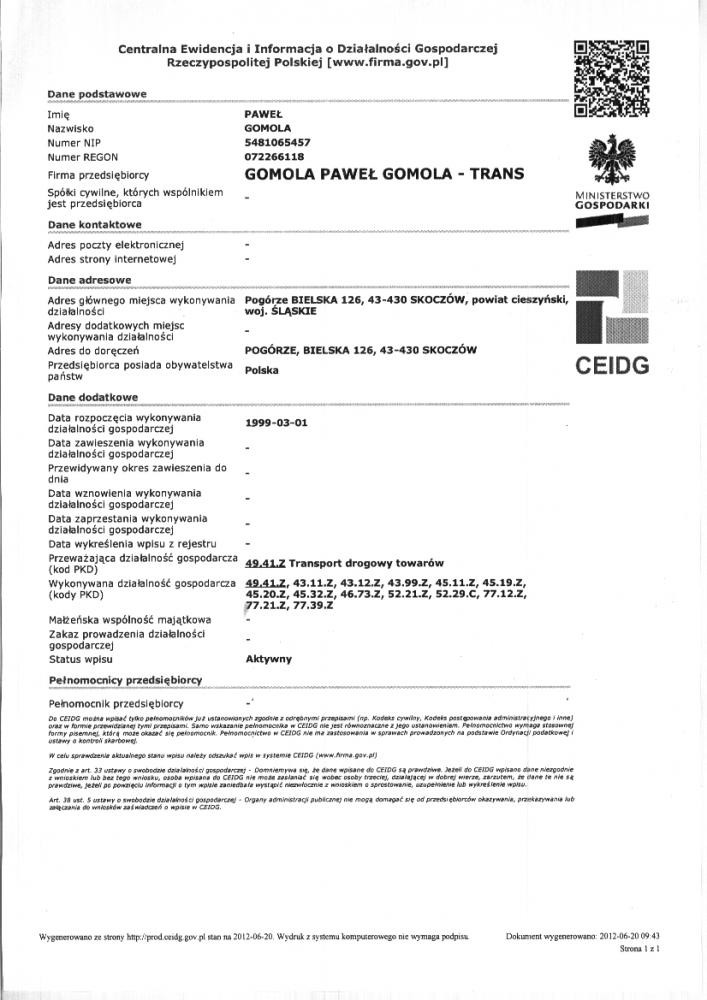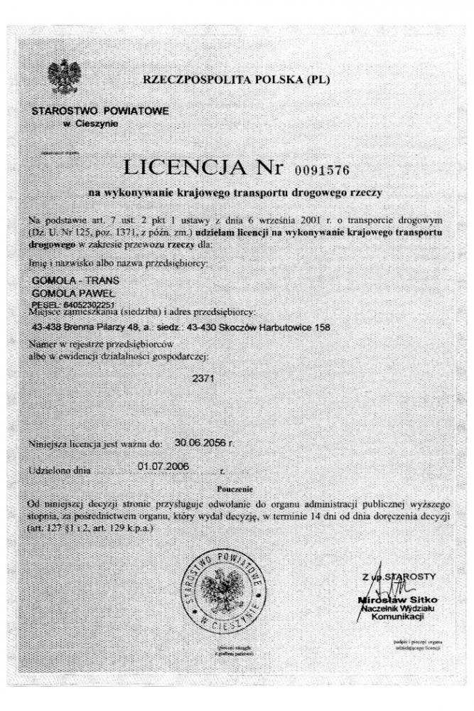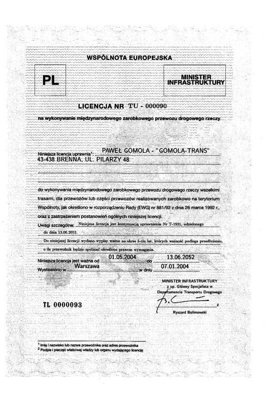 Poniżej przedstawiamy komplet dokumentów uwiarygodniający naszą działalność jako firmy transportowej (kliknij na miniaturkę aby powiększyć):