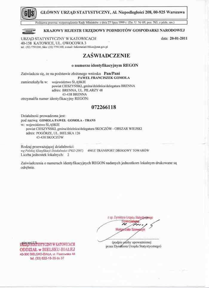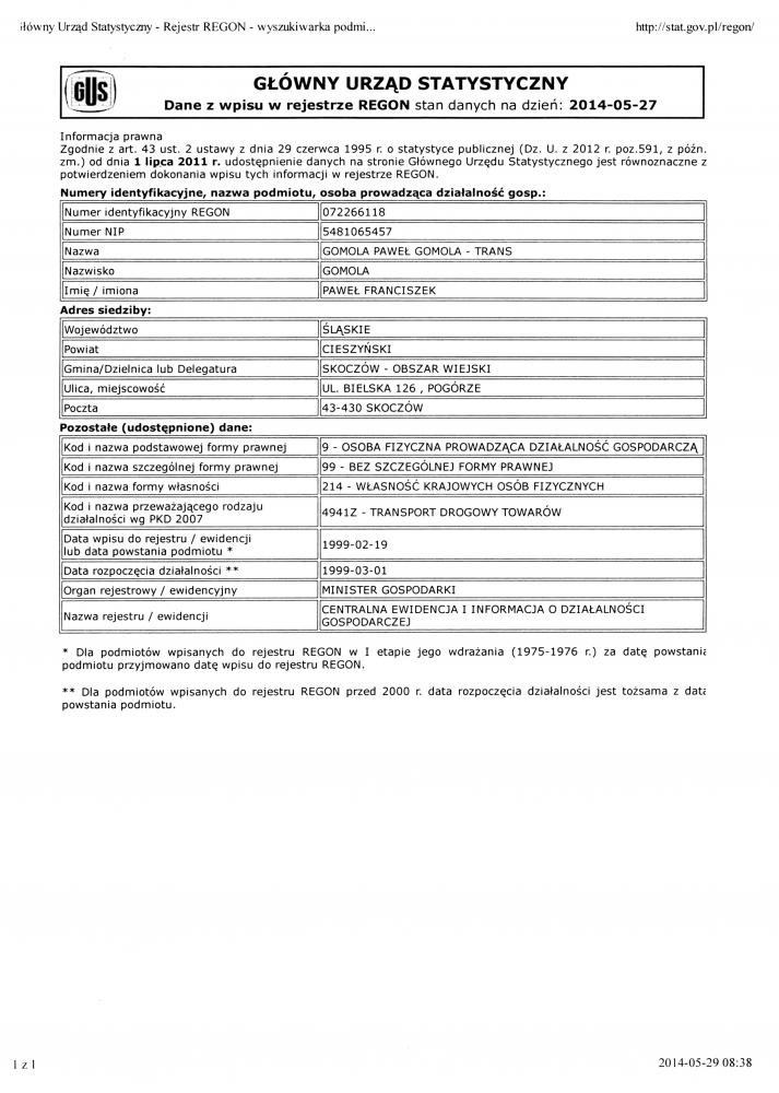 Główny Urząd Statystyczny - dane z wypisu w rejestrze REGON