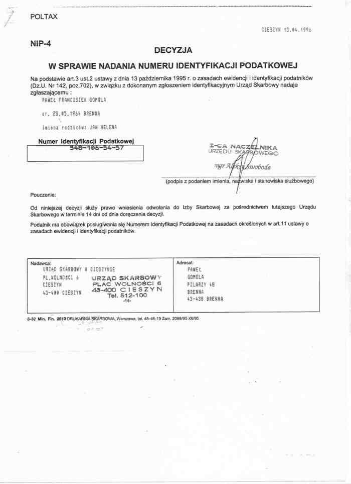Decyzja w sprawie nadania numeru identyfikacji podatkowej NIP