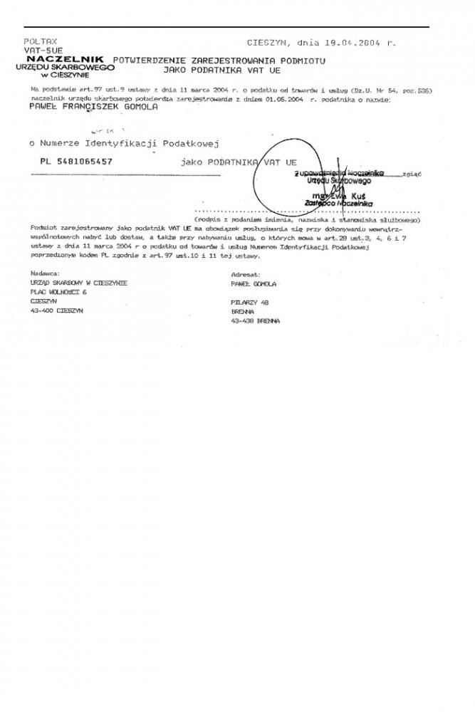 Potwierdzenie rejestracji podmiotu gospodarczego jako płatnika VAT EU